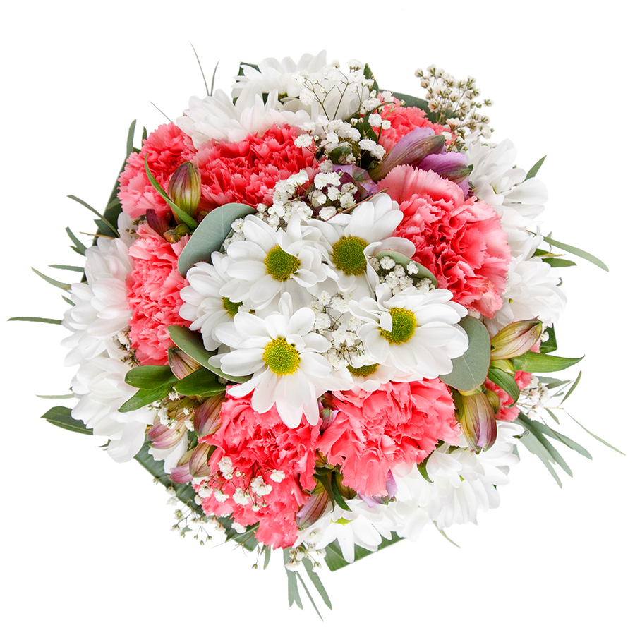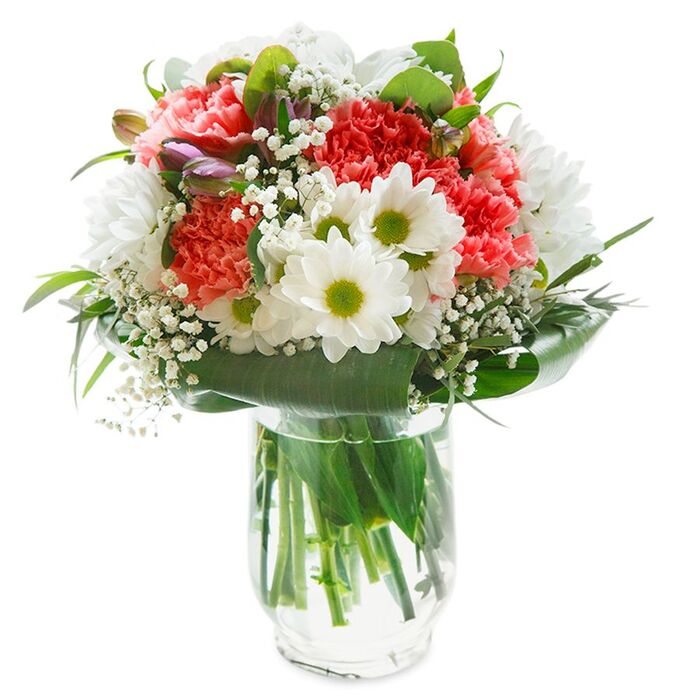 Elevate your surroundings with the serene beauty of our floral masterpiece. Designed with an eye for detail, this arrangement pairs pristine white chrysanthemums, light pink carnations, and delicate gypsophila with elegant aspidistra leaves. Each bloom is hand-picked to ensure exceptional freshness and quality, creating a truly captivating display.